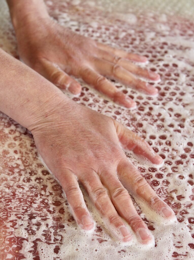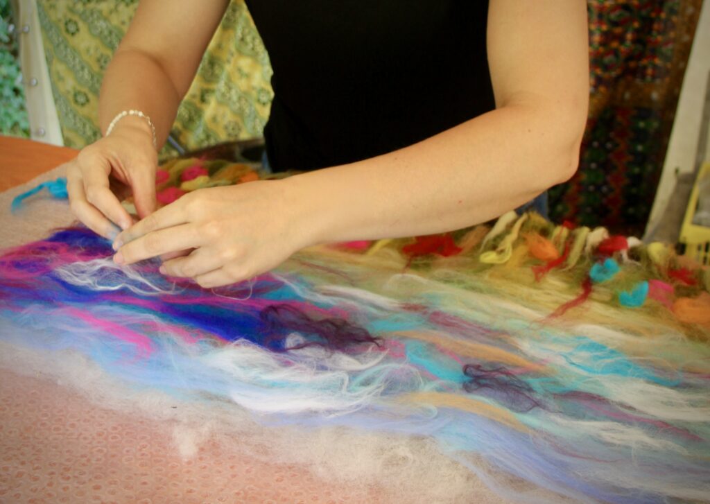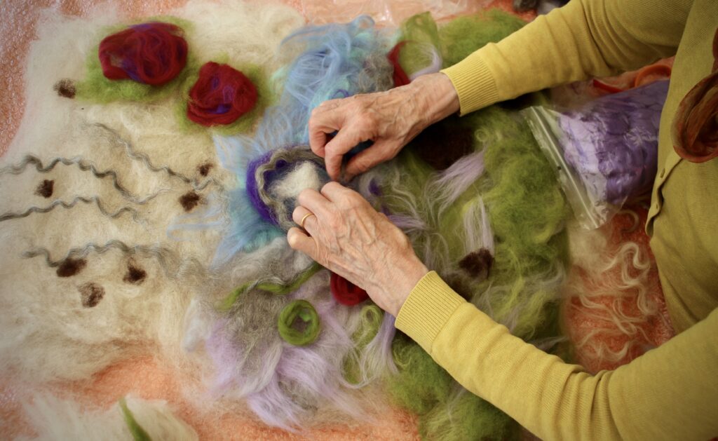 Vilten is een oeroude techniek die, naast het maken van kleding, ook gebruikt wordt in de beeldende kunst. Het is een veelzijdige techniek waarbij je zowel op het platte vlak als driedimensionaal kunt werken. Vilt wordt gemaakt van schapenwol en ontstaat door een proces van wrijving in combinatie met water en zeep. Hierdoor klitten de schubjes van de wolvezels aan elkaar tot een vaste stevige lap. We maken gebruik van het ‘krimp proces’: Onder invloed van de druk die we uitvoeren en de warmte van het water krimpt de wol, dat maakt het stevig. Het werkstuk eindigt daarom iets kleiner dan bij aanvang.